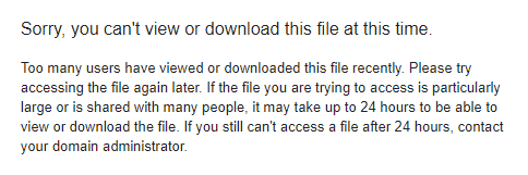 Sorry, you can't view or download this file at this time.Too many users have viewed or downloaded this file recently. Please try accessing the file again later. If the file you are trying to access is particularly large or is shared with many people, it may take up to 24 hours to be able to view or download the file. If you still can't access a file after 24 hours, contact your domain administrator.