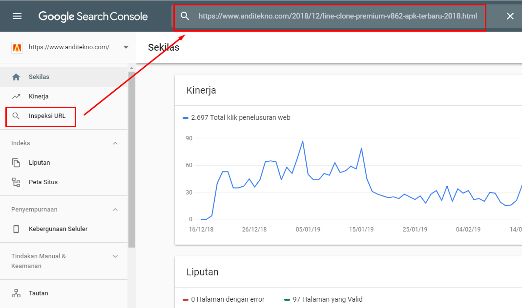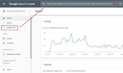 - Klik Menu "Inspeksi URL" kemudian masukkan link artikel yang ingin anda submit ke google